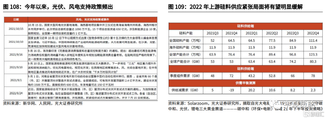 政策支持叠加经营改善,光伏、风电高景气有望延续。新项目的不断投产或许将促使相关行业保持高景气。而成本端的负面因素也将逐步发生变化,以光伏为例,上游硅料价格高企是导致今年光伏装机不及预期的重要原因,而随着明年上半年相关项目陆续投产,硅料供需紧张格局有望改善,进而推动光伏下游全面放量。整体而言,光伏和风电可能将是2022年为数不多能够维持高景气的板块。