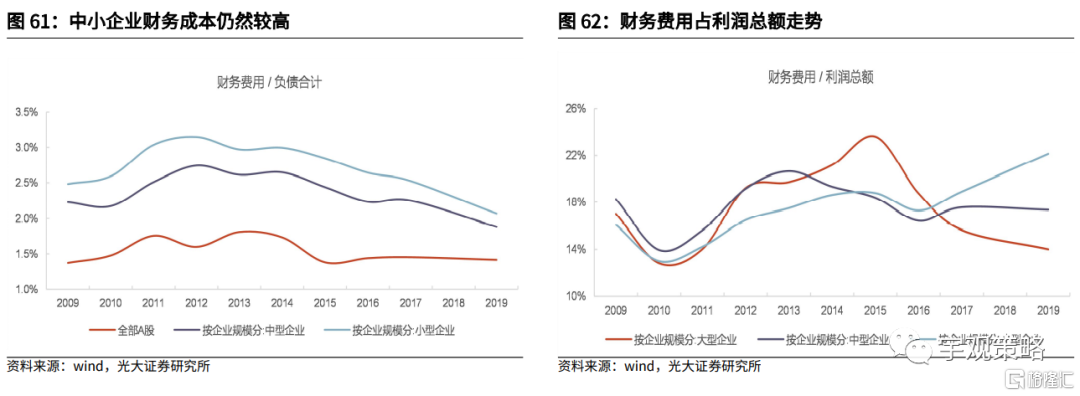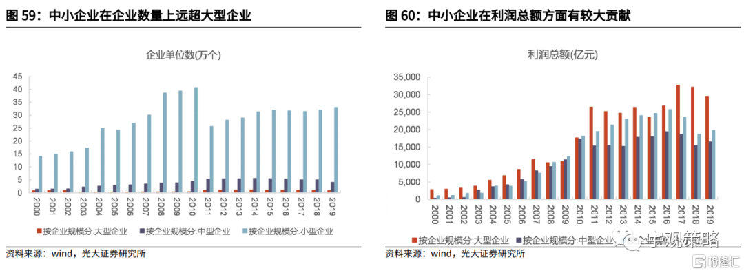 北交所的核心职能是加强对于中小企业的服务。中小企业是国民经济的重要组成部分,中小企业在企业数量上远超大型企业,在利润总额方面也有较大贡献。但在融资难、融资贵问题困扰下,中小企业创新发展受到一定程度制约。以财务费用/负债来衡量企业的融资成本,2019年大型(以上市公司来衡量)、中型及小型企业财务费用/负债比率分别为1.4%、1.9%和2.1%,中小型企业融资成本明显高于大型企业。