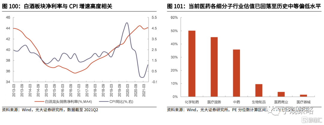 白酒业绩相对优势逐步凸显,CPI温和回升有助于板块盈利改善。一直以来,白酒的业绩都具有较高的稳定性,不过在今年这反而成为其相对业绩的压力来源。即使今年白酒板块是少数保持了高景气及稳健增长的消费子行业,其相对业绩也难以与成长或者周期相提并论。不过2022年,在整体业绩增速下行的背景之下,白酒的相对景气优势将逐步回归。此外,白酒板块净利率与CPI走势有一定相关性,随着明年CPI增速稳步回升,白酒板块经营业绩也有望持续改善。