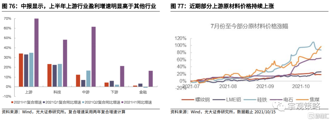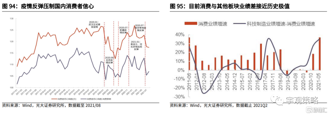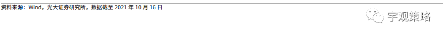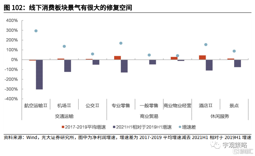 由于疫情的原因,线下消费相关板块的景气持续低迷。今年盈利的高增长使得很多行业的盈利水平回到甚至超过了疫情前的水平,但与线下消费相关的板块仍然低迷。我们比较了各板块2021年上半年相对于2019年的增速,与2017-2019年复合增速之间的差距,航空、零售、酒店、机场等行业仍然有极大修复空间。若明年线下消费改善,这些板块可能具有很强的盈利弹性。