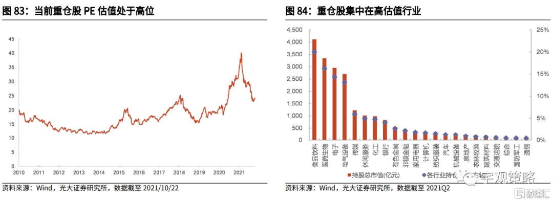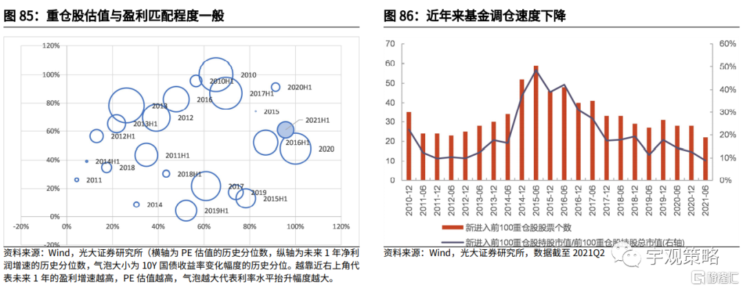 如果考虑到估值与盈利预期增速、流动性的匹配状况,现在基金重仓股的情况并不乐观。当前基金重仓股盈利预期增速与流动性环境都接近2010年以来的中位数水平,但估值要显著偏高。考虑到近几年来基金的换手速度也处于历史的低位,预计当前重仓股相对偏高的估值可能会限制基金在2022年的表现。