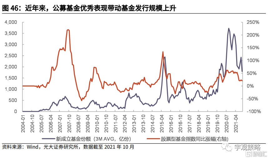 基金赚钱效应的提升是近年来居民资金流入机构的核心原因。2019年以来,公募基金的持仓占比大幅提升,而且这一轮新发基金情况要远好于新开户数,居民资金更多的流入了机构,而非通过个人账户投资。这主要得益于赚钱效应带来的居民资金持续流入。从数据来看,股票基金指数的同比变化对于新成立基金份额有显著的影响,并略微领先,而2019年以来基金的良好表现也是新基金大幅发行的重要支撑。