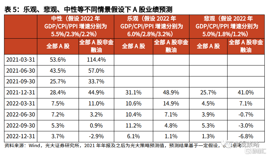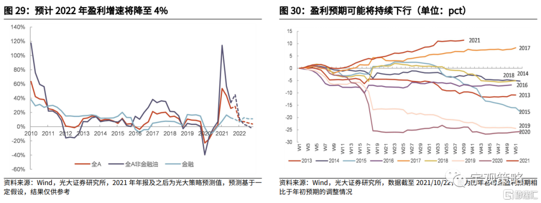 预期2022年企业盈利增速将会下行至4%。2021年,预计企业盈利增速将达到29%,这一增速也是2011年以来的年度维度上的最高水平。但2022年,在经济增长趋弱,价格因素逐步退坡的情况下,盈利增速会大幅下降至4%左右。这一增速与2021相对于2019年的复合增速17%相比仍要显著得低。不同的假设之下,上市公司盈利增速将在0%到8%之间浮动。整体而言,盈利增速将出现显著的下行。