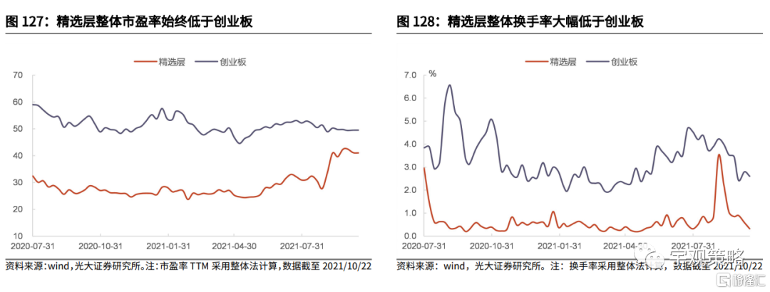 精选层估值长期受流动性影响整体偏低,未来有望随北交所开市迎来重估。如前文所述,精选层与创业板在各方面均比较相似,理论上两者估值应该相近,但实际上自精选层成立以来,其估值始终低于创业板,市盈率平均值为28.8倍,而创业板市盈率平均值则为51.4倍。这主要是因为新三板精选层整体投资者数量少、股票流动性相对较差,精选层的换手率在大多时候均小于1%,而创业板基本维持在2%以上,相对较高的换手率使得创业板股票普遍能享受一定的流动性溢价,因此估值要高于精选层。北交所个人投资者门槛相比原来精选层明显降低,未来随着精选层股票整体被移至北交所,精选层股票估值有望迎来重估,或将接近创业板估值。