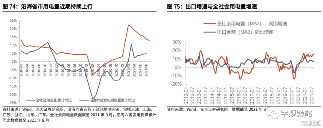 需求偏强是电力紧张的基础。我们认为,需求是今年多数异常波动的基础因素,截至今年9月,全社会用电量累计同比增速为12.9%,显著高于历史同期增速。出口与制造业的强势是电力需求旺盛的重要因素之一,这也是为什么今年沿海省份用电需求显著偏强的重要原因。