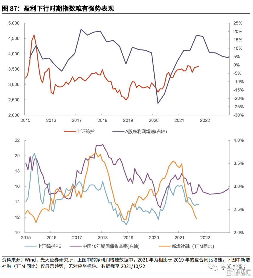 2022年,基数效应导致的短期高增长将会过去,盈利增长将显著下行。流动性的边际宽松对于市场会有所支持,同时政策的落地也会提供一定的利好,这二者能否对冲盈利增速与盈利能力的下行仍然有待观察,从历史情况来看恐怕并非易事。中美关系超预期的好转可能会给市场带来惊喜。