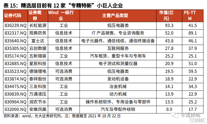 北交所也是“专精特新”标的聚集地,长期投资价值值得挖掘。精选层66家公司中,目前有12家“专精特新”小巨人企业,其中有5家属于工业行业、4家属于信息技术行业、3家属于可选消费行业。短期来看,精选层“专精特新”股票受流动性因素影响,整体估值低于A股“专精特新”上市企业,2021年10月15日,精选层“专精特新”企业市盈率为38.3倍,而A股“专精特新”企业估值为54.2倍,未来随着精选层股票整体被平移至北交所,“专精特新”企业估值也有望大幅抬升,短期投资价值较高。长期来看,在中美博弈及中国制造业转型升级背景下,“专精特新”企业大有可为,股票也极具投资价值。2019年至今,中美博弈背景下,国内对于制造业及专精特新企业的支持政策频出,专精特新指数也明显跑赢了同期沪深300指数,2019年至今,专精特新指数上涨202.6%,而同期沪深300指数仅仅上涨64.0%。