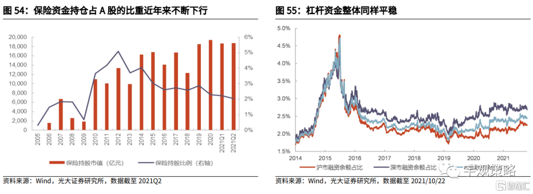 保险资金持仓占比有所下降,杠杆资金保持平稳。其他重要资金流入方向来看,预计保险持仓仍将略有下行。近年保险持仓规模占A股市值比重显著下降,这或与保险资金的投资偏好与近来的市场风格不同有关。杠杆资金近年来受到了监管的密切关注,整体变化不大,预计2022年仍将保持平稳。