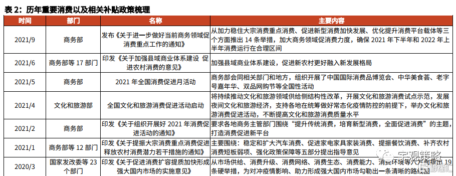 消费刺激可能涉及到家电、汽车以及大众消费品等方向。从以往的经验来看,家电补贴、汽车补贴是常见消费刺激方向,也是各地方消费刺激政策的发力点,尤其是“双碳”政策之下,新能源汽车板块可能将受益。除此之外,若明年消费补贴通过消费券等方式推行,可能大众消费品也将受益。建议关注家电、新能源汽车、食品等行业。