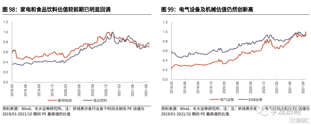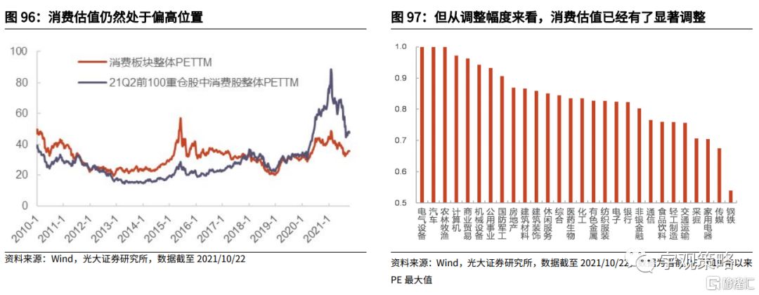 我们以各板块2021年预期估值相比于过去24个月高点的下降水平来衡量其估值调整的幅度。目前家电、食品饮料、轻工制造、纺织服装,医药生物等板块的估值调整幅度已经位居前列,并且要显著的高于成长板块。相比于目前市场情绪仍然在顶部的科技成长行业,消费行业当前的估值已经有了一定的优势。