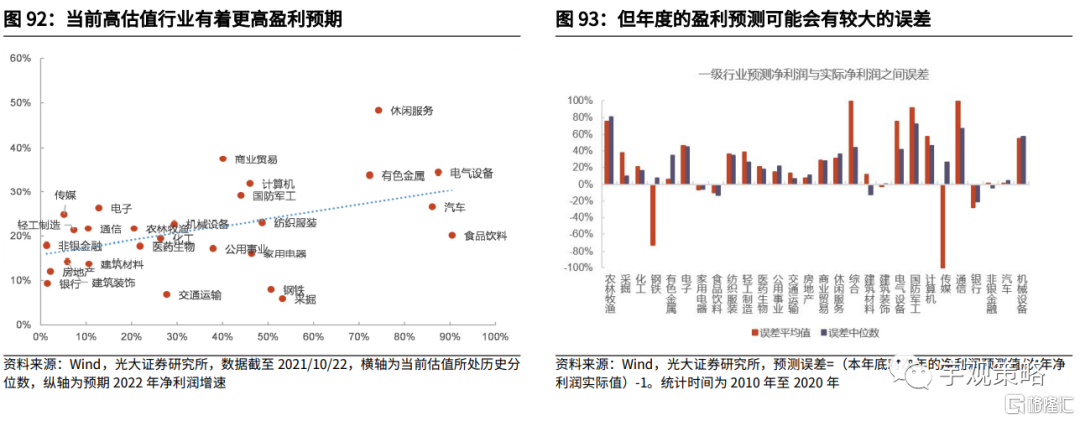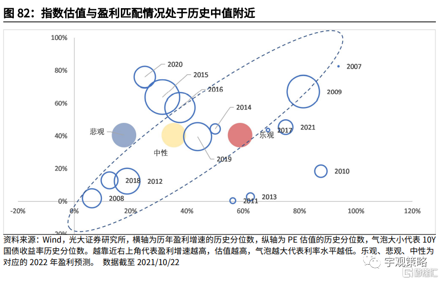 若2022年整体盈利偏弱,预计指数难以有较强的表现。当前市场估值-盈利匹配程度处于历史中位数水平,考虑到相较于今年,2022年市场的盈利下行趋势将十分明显,这可能会给指数带来一定的压力。不过明年流动性的边际宽松和政策的发力可能会给市场提供一定的支撑。中美关系如果出现了超预期的好转可能会给市场带来惊喜。