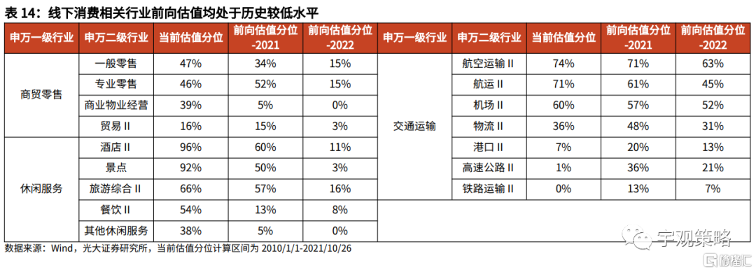相关板块也处于低位。由于景气的低迷,线下消费相关板块也处于历史低位。对于酒店、景点、旅游等线下消费,由于疫情使得盈利明显下滑,进而使得行业估值被动抬升。这样的表现与处于底部时的周期板块有一定的相似性,如果未来景气回升,或许也将有较高的弹性。建议关注航空、机场、酒店、专业零售等行业。