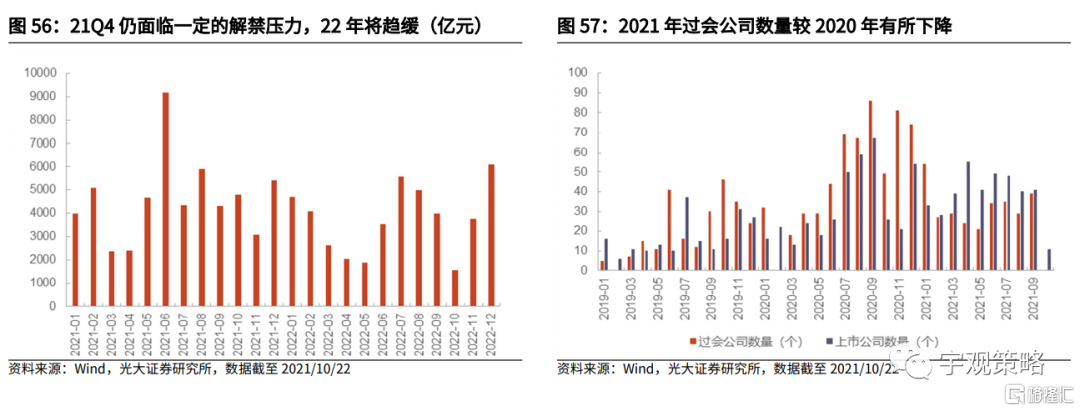 今年四季度市场仍将面临一定的解禁压力,预计2022年将趋缓。在经历了6月份宁德时代的大规模解禁后,下半年整体的解禁规模较为平稳,各个月份的解禁水平相对接近,整体仍将维持在较高水平。2022年整体来看解禁压力将趋缓,全年解禁规模预计为4.48万亿元左右,低于2021年全年的5.55万亿元。