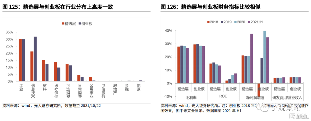 精选层与创业板在行业分布、财务指标上非常相似,ROE、盈利增速方面甚至优于创业板。精选层与创业板行业分布非常相似,公司均主要集中于工业、信息技术、材料、医疗保健及可选消费五个行业。从最近3年(2018-2020年)的财务指标来看,毛利率方面,精选层平均毛利率为27.8%,创业板为28.9%,两者毛利率十分接近;ROE方面,精选层平均ROE为14.6%,创业板为4.7%,精选层ROE大幅领先创业板;净利润增速方面,精选层平均净利润增速为25.0%,创业板为5.5%,精选层平均净利润增速领先创业板且更加稳定;研发投入强度方面,精选层研发费用/营业收入平均值为4.2%,创业板为4.6%,两者研发投入较为接近。