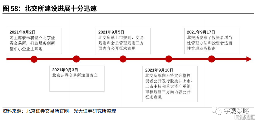 北交所自9月2日被提出以来,建设进展十分迅速。2021年9月2日,国家主席在2021年中国国际服务贸易交易会全球服务贸易峰会致辞中表示:“我们将继续支持中小企业创新发展,深化新三板改革,设立北京证券交易所,打造服务创新型中小企业主阵地”;次日,北京证券交易所注册成立;9月5日,北交所就上市规则、交易规则和会员管理规则三方面内容公开征求意见;此后,北交所陆续就其它规则公开征求意见,并发布了投资者适当性管理办法及投资者适当性管理业务指南。