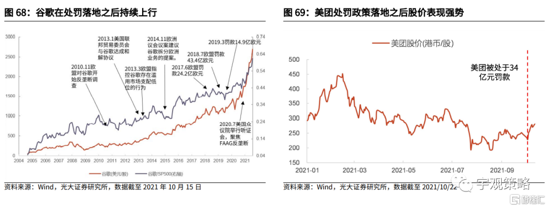 预计2022年反垄断政策进一步落地,政策的不确定性消除,资产价格有望回归到正常的轨道中去。目前股价已经较为充分地反映了对于政策悲观预期,因此反垄断政策处罚落地之后,股价一般会有正面的反应。毕竟对于互联网巨头而言,政策的不确定性本身就是最大的风险,一旦政策转为确定,实际监管与处罚措施对于公司的影响都较为有限。政策可能会影响这些企业上行的斜率,但是并不会改变上行的方向,这在海外市场上也是如此。因此如果明年监管政策不确定性逐步消除,无论是对于相应的公司,还是对于市场整体而言,都将是一件好事。