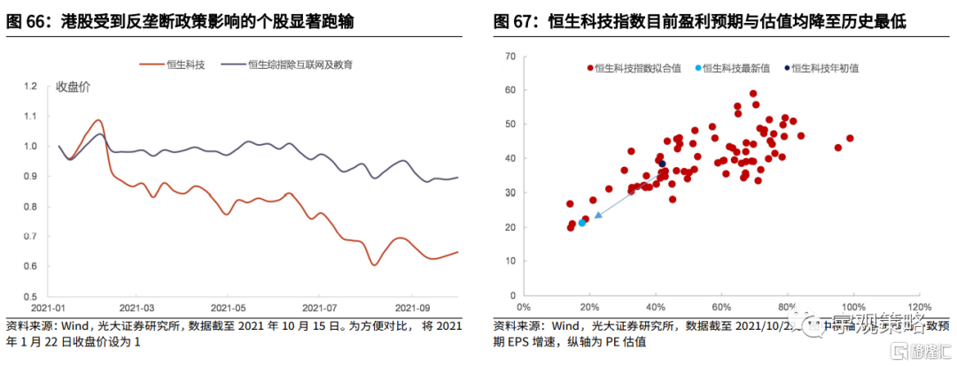 反垄断政策对于相关指数已经产生了非常显著的影响。政策的波动也带来了股票价格的显著波动。以受到政策影响更明显的港股为例,近半年以来,受到反垄断以及相关政策影响的行业与个股表现显著落后于市场整体。而互联网与平台类企业占比较高的恒生科技指数,其估值以及盈利预期都已经下调到历史最低水平附近。而整个行业受到了政策严重影响的教培行业股价更是一蹶不振。