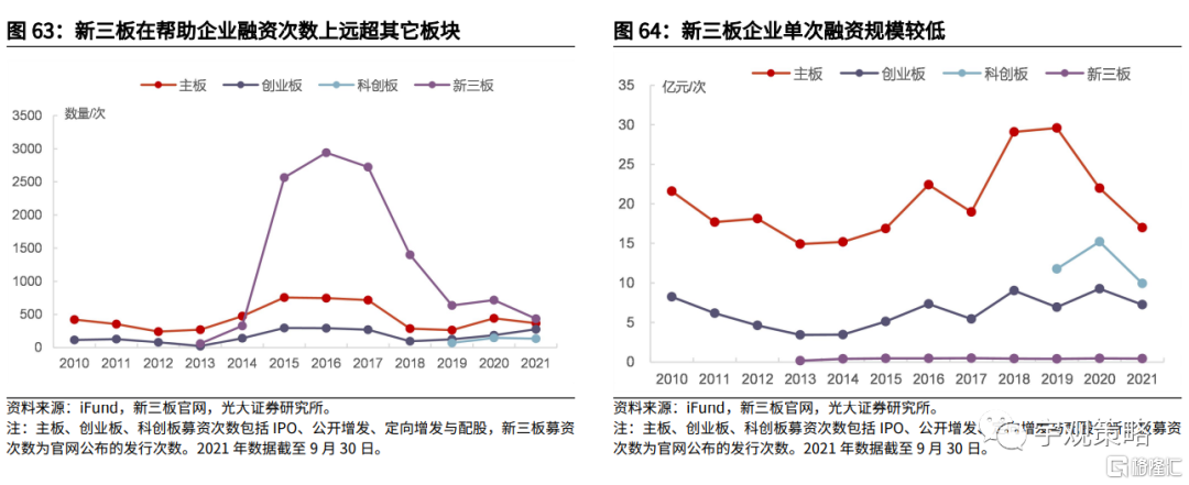 北交所定位于服务创新型中小企业,有望通过资本赋能助力中小企业创新发展。2013年以来新三板共帮助企业融资11811次,在融资次数上远超主板、创业板及科创板。然而,在单次融资规模上,新三板平均融资规模仅为0.4亿元,远远低于其他板块。这难以满足中小企业创新发展需要,而北交所定位于服务创新型中小企业,预计单次融资规模将介于新三板精选层及创业板之间,未来有望通过资本赋能助力中小企业更好发展,积极促进中小企业进行创新。