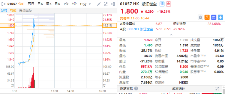 华盛资讯11月5日消息,浙江世宝港股大涨19%,现报1.8港元,成交额超1800万港元,换手率为4.91%。