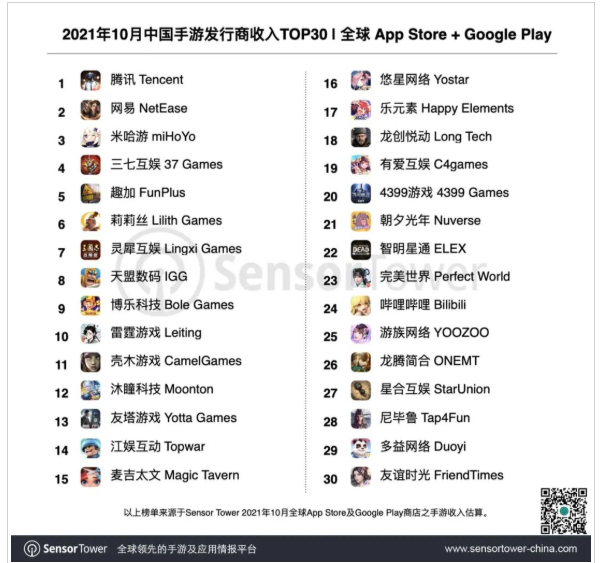 Sensor Tower商店情报平台显示,2021年10月中国手游发行商在全球 App Store 和 Google Play 的收入排名。本期共36个中国厂商入围全球手游发行商收入榜TOP100,合计吸金超过23.8亿美元,占全球TOP100手游发行商收入的40%,详细报道如下。
