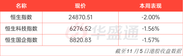 恒生指数本周跌2%,报24870.51点;恒生科技指数本周跌1.56%,报6276.52点;国企指数本周跌1.57%,报8820.83点。