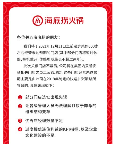 11月5日,海底捞公告,将于2021年12月31日前逐步关停300家左右经营未达预期门店,其中部分门店将暂时休整、择机重开,休整周期最长不超过两年。