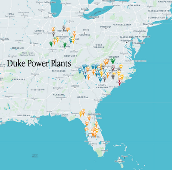 杜克公司旗下有许多种类型的发电厂,包括火力、水力、天然气、核能、太阳能和风能发电站,以及电池储存设施。这些发电厂分布在美国加州、佛州及中西部地区。