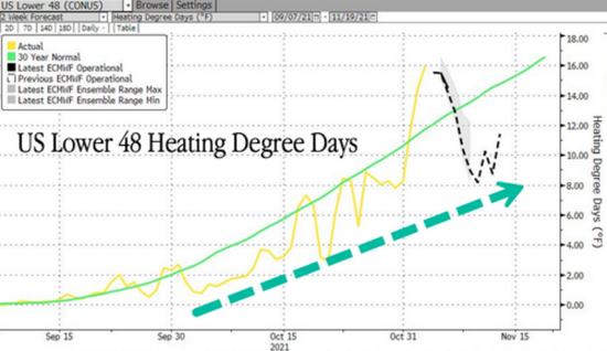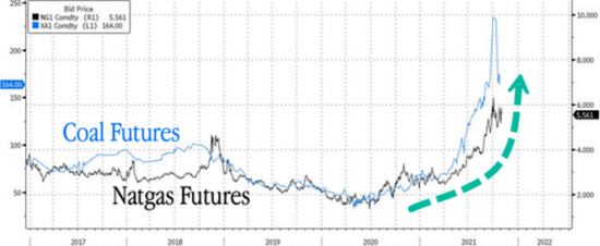 “燃煤和天然气价格飙至2014年来的最高位。这两种重要的大宗商品目前库存告急。我们已经有一段时间没看到大宗商品价格飙至这样的峰值了。2014年异常寒冷的冬天曾推高天然气价格。”