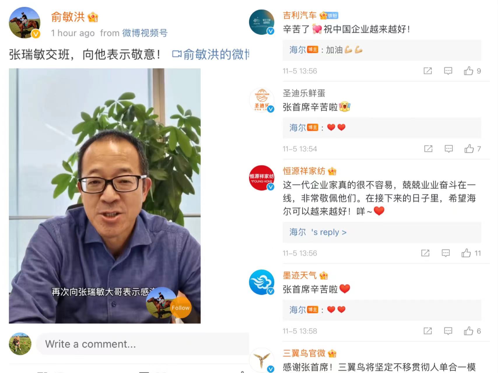 张瑞敏“退休”的消息,让海尔官方微博的评论区迎来了不少网友,他们纷纷感慨:“时代的企业,时代的企业家。”“张瑞敏是一个时代的标杆,中国质量,中国制造的代名词。”“他的时间智慧,构成了中国企业家创新思维的高峰。”在评论区互动的还有吉利汽车、恒源祥家纺等耳熟能详的老牌制造企业。