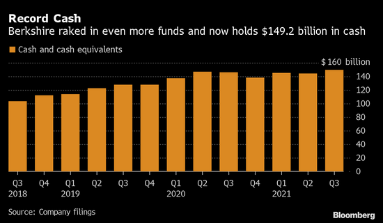 伯克希尔周六公布的财报显示,第三季度的现金储备达到1492亿美元的新高,超过2020年初创下的纪录高点。尽管在此期间,巴菲特还投入76亿美元回购本公司股票,创出2018年董事会调整回购政策以来纪录第三高水平。