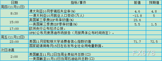 周四(11月11日)、周五(11月12日)关键词:澳洲失业率、英国GDP、OPEC月报、美国消费者信心