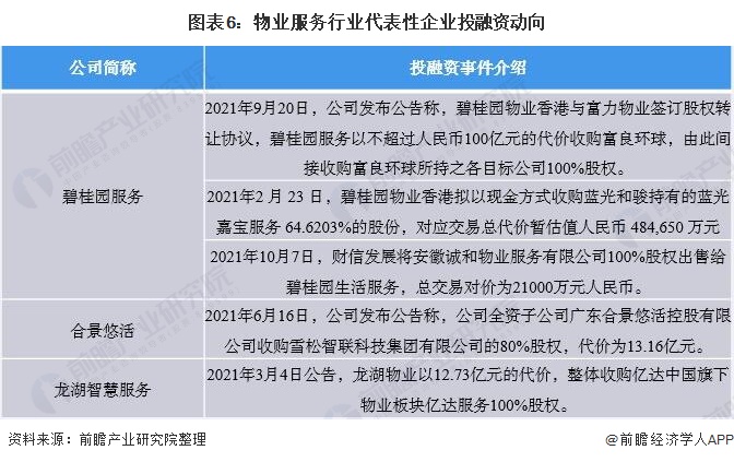 2021年以来,物业服务行业头部企业投融资较为活跃,其中投资项目多以物业服务企业并购为主。物业服务代表性企业最新投融资动向如下: