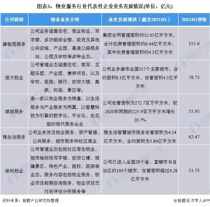 物业服务行业主要上市公司:目前国内物业服务行业相关上市企业有招商积余(001914.SZ)、南都物业(603506.SH)、碧桂园服务(06098.HK)、绿城服务(02869.HK)、雅生活服务(03319.HK)、恒大物业(06666.HK)、彩生活(03319.HK)、新悦城服务(01755.HK)、中海物业(02669.HK)、奥园健康(03662.HK)、合景悠活(03913.HK)、华润万象生活(01209.HK)等。
