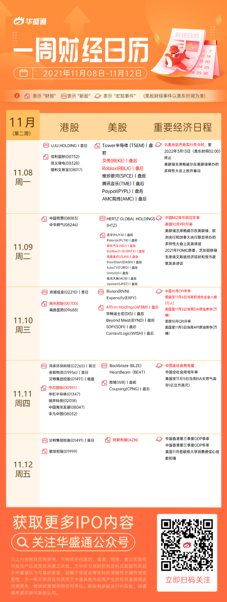 还值得注意的是,优矩互动 $01948.HK 将于周一(11月8日)正式登陆港交所,该公司是一家领先的线上营销解决方案提供商,专门在中国从事线上短视频营销,拥有高效、有效及专有的线上营销解决方案服务平台—优量引擎平台。公司与众多优质媒体合作伙伴均建立了长期的合作伙伴关系,具体来看包括了字节跳动(抖音、头条)、快手、阿里巴巴、搜狗搜索、360搜索等。