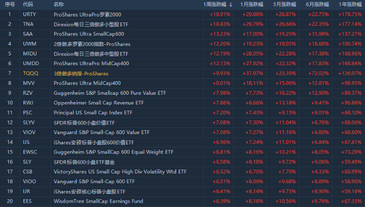 其中,ProShares UltraPro罗素2000 $URTY 涨18.91%,该ETF今年已涨超68.03%,一年涨幅高达178.75%;Direxion每日三倍做多小型股ETF $TNA 涨18.83%,ProShares UltraSmallCap600 $SAA 涨13.23%,另外,2倍做多罗素2000指数-Proshares、Direxion每日三倍做多中型股ETF、ProShares UltraPro MidCap400等均涨超12%。