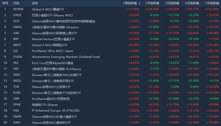 本周巴西小盘股ETF-iShares MSCI $EWZS 领涨区域ETF,涨幅达9.32%;iShares安硕MACI智利封顶可投资市场指数基金 $ECH 涨7.87%,3倍做空富时中国50指数-Direxion $YANG 涨6.82%。