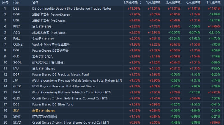 ETF方面,本周2倍做多黄金-PowerShare $DGP 涨3.90%;铂金ETF-ETFS $PPLT 涨2.24%;2倍做多白银-ProShares $AGQ 涨2.20%。