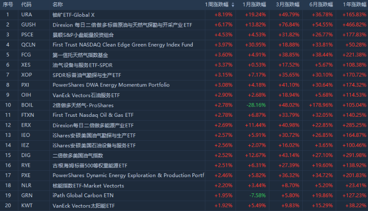 本周涨幅来看,铀矿ETF-Global X $URA 累涨8.19%;Direxion每日2倍做多标普原油与天然气探勘与开采产业ETF $GUSH 累涨6.17%,今年以来已涨超207.31%,一年涨幅已达466.82%;景顺S&P小盘能量投资组合 $PSCE 累涨4.53%。