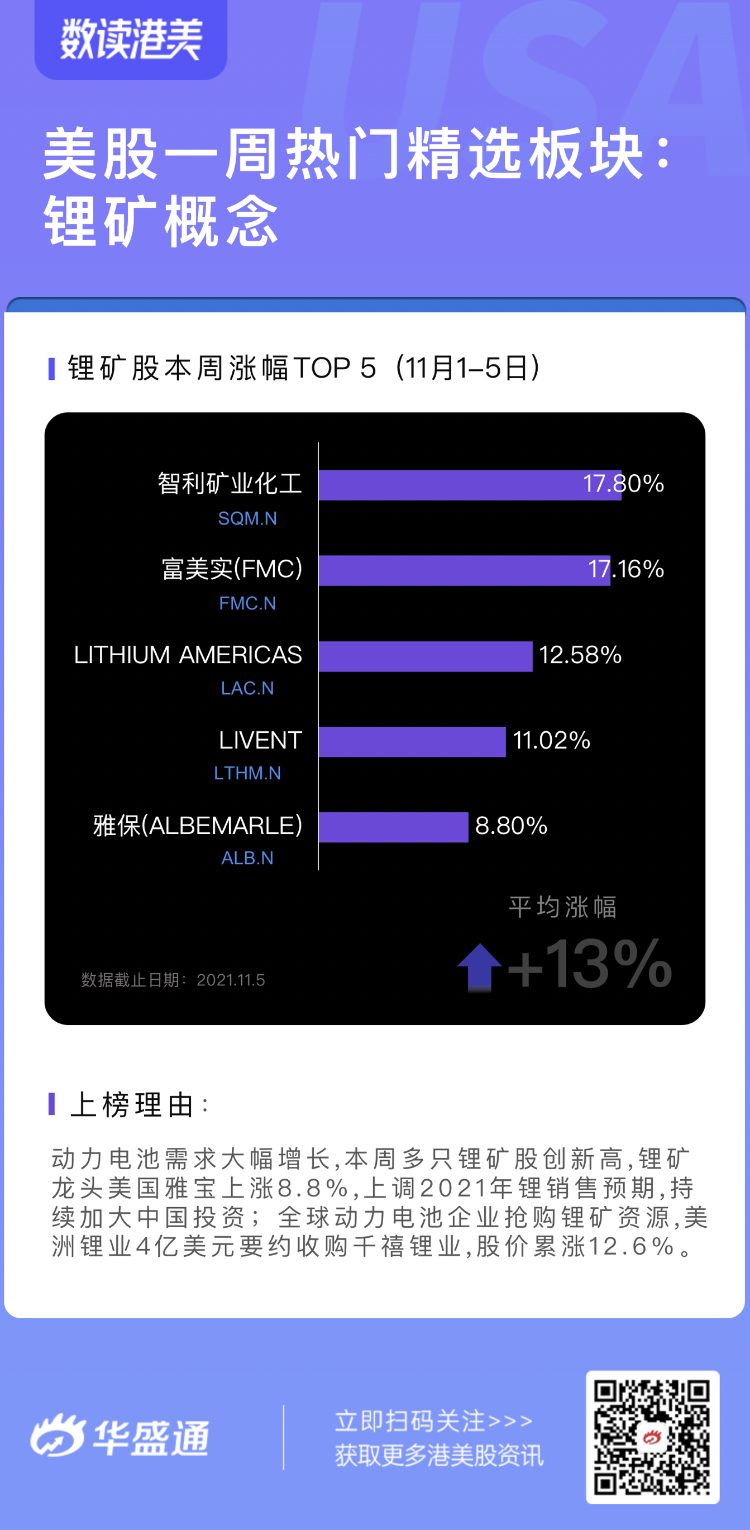 据华盛资讯统计分析,本周美股市场热门板块为“锂电板块”,多只锂矿股创新高。涨幅前10只锂矿股中,智利矿业化工实力冲击排名第一,涨幅17.79%,锂矿龙头美国雅宝业绩超预期,本周涨幅8.7%;美洲锂业4亿美元要约收购千玺锂业。