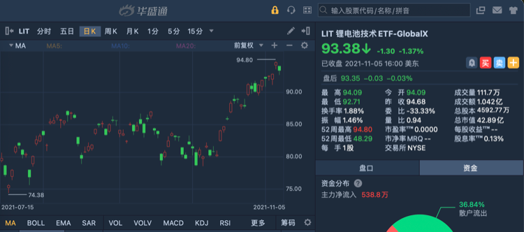 相关衍生品也正在反弹,锂电池技术ETF:Global X Lithium(LIT)周四在创下94.8美元的历史新高。