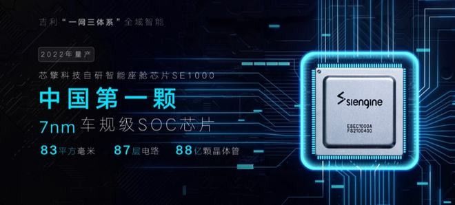 在“智能吉利2025”大会上,吉利汽车公布,吉利“芯擎”科技自研、采用了车规级7nm工艺的智能座舱芯片SE1000在完成车规级认证后,明年即将量产。这将成为中国第一颗7nm制程的车规级SOC芯片。