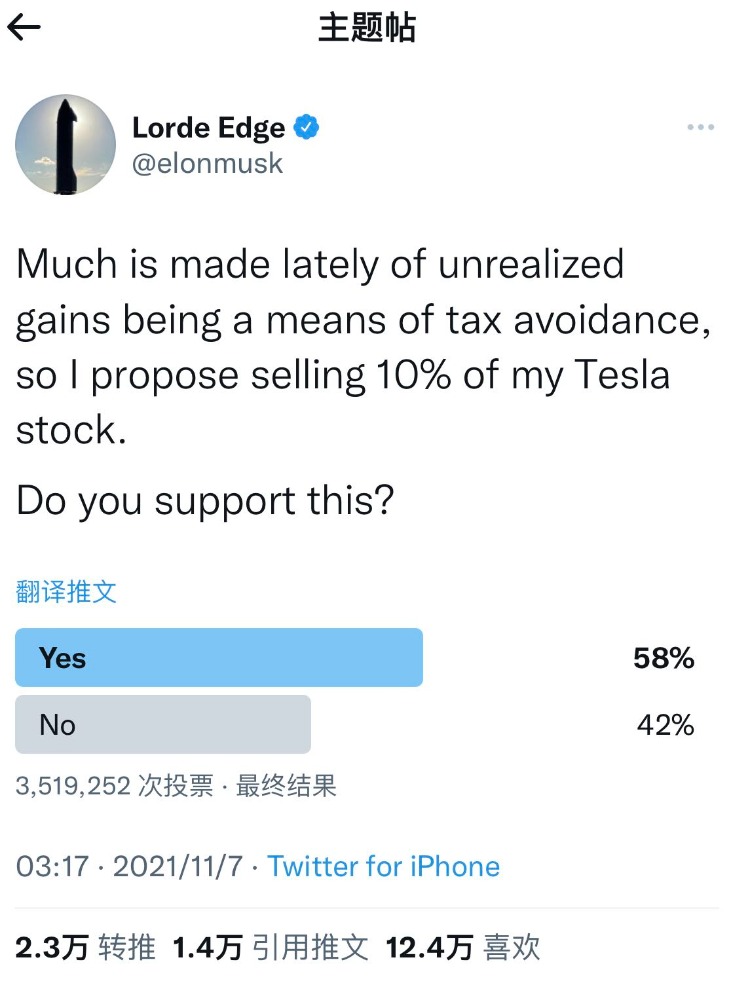 3、超5成粉丝赞同马斯克出售10%特斯拉股票