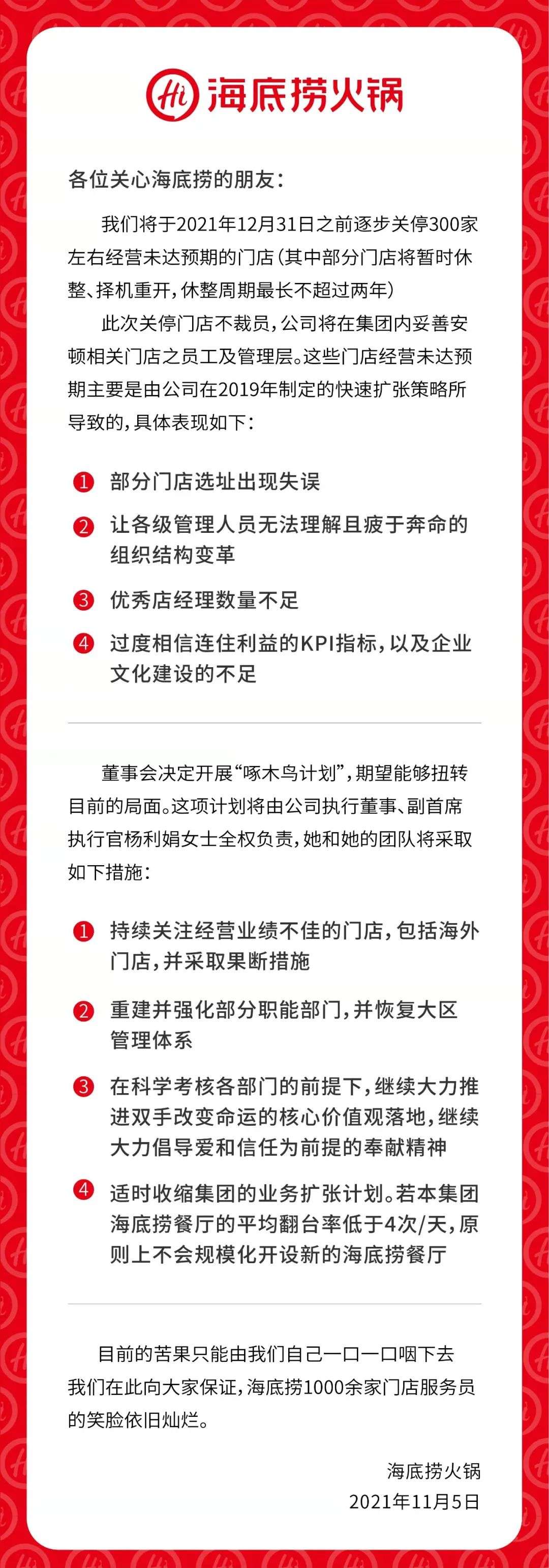 第一,部分门店选址出现失误 ,海底捞将于今年年底前,逐步关停300家左右经营未达预期门店,果断“断尾”提升管理效率和经营水平。