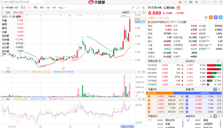 华盛资讯11月8日消息,华为概念股汇聚科技再度大涨,盘中最大升幅接近18%。自10月21日拉升以来,股价累计升幅已超55%。截至发稿,汇聚科技涨15.79%,报0.66港元,成交额2158万港元。