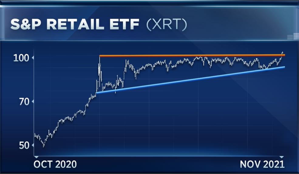 “我们确实喜欢盘整后突破的模式,这正是你现在在零售业看到的情况,”他指着SPDR标普零售ETF(XRT)的图表表示。