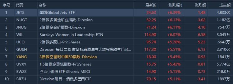 从ETF涨幅榜来看,涨幅居首位的是美国Global Jets ETF $JETS 大涨6.39%,成交额4.833亿美元;其成分股主要有联合大陆航空、美国航空、西南航空、达美航空等航空公司。