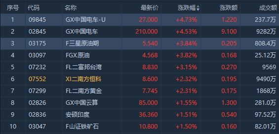从ETF涨幅榜来看,涨幅位居首位的是GX中国电车ETF $02845.HK 涨4.53%,成交额9282万港元;其成分股包含了A股锂矿概念股的亿纬锂能涨近16%、赣锋锂业涨近8%等。F三星原油期货ETF $03175.HK 涨3.84%,成交额808.4万港元。