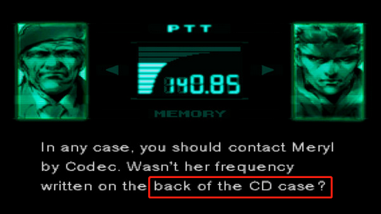 发售于 1998 年的《潜龙谍影》初代,在游戏流程初期的一场 Boss 战结束后,情节推进到需要联络潜伏在敌方内部的内应人员;然而,攸关后文展开的无线电联络频率,却在这时莫名其妙地遗失了(相关 NPC 表示“忘记了”),怎么办?