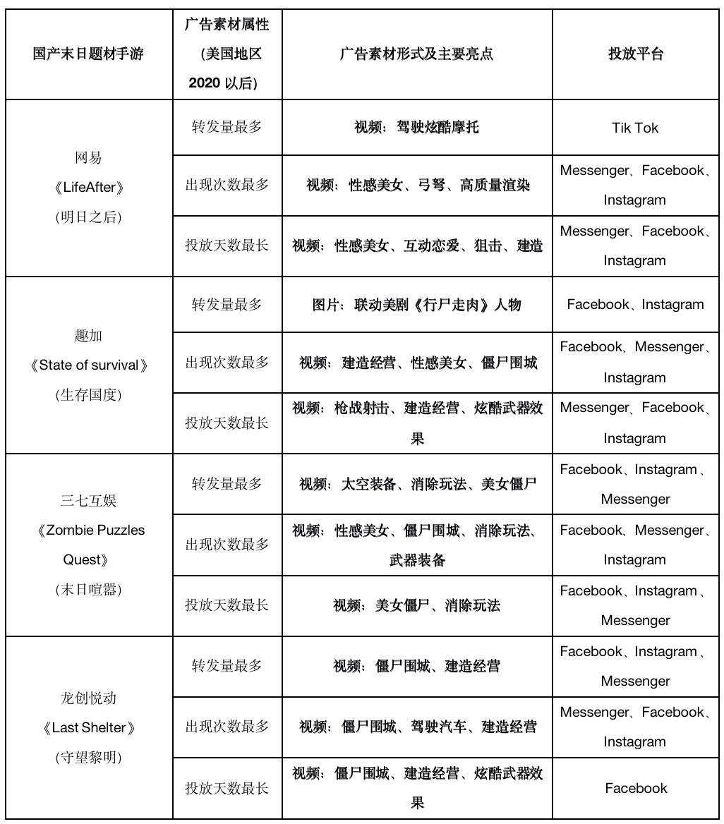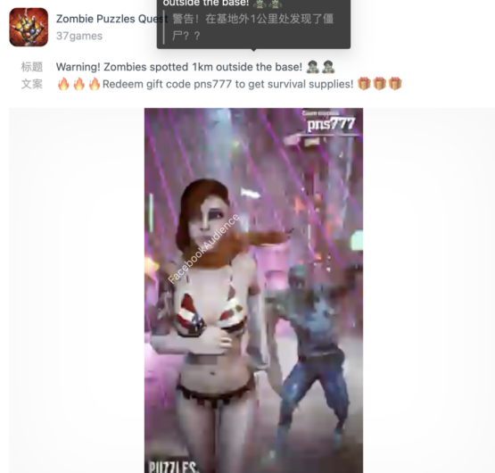 ②广告素材:视频为主,素材往往直接呈现玩法,展示角色与环境的互动,以及与丧尸的对抗,进而营造紧迫感。对抗的方式,比如武器、装备(特别是汽车、摩托车、机甲)则往往是广告内容会突出的亮点,对抗的角色中,身材火辣甚至穿着泳装的美女角色或者美女丧尸,则出现在更多的广告素材中。此外,趣加联动《行尸走肉》,网易创新地突出摩托、宠物狗的元素、三七互娱加入太空元素,算是让人眼前一亮。作为对比,其它国家的同类题材则大多较传统,以主要展示玩法与紧迫感为主。