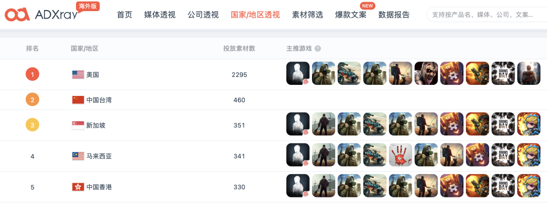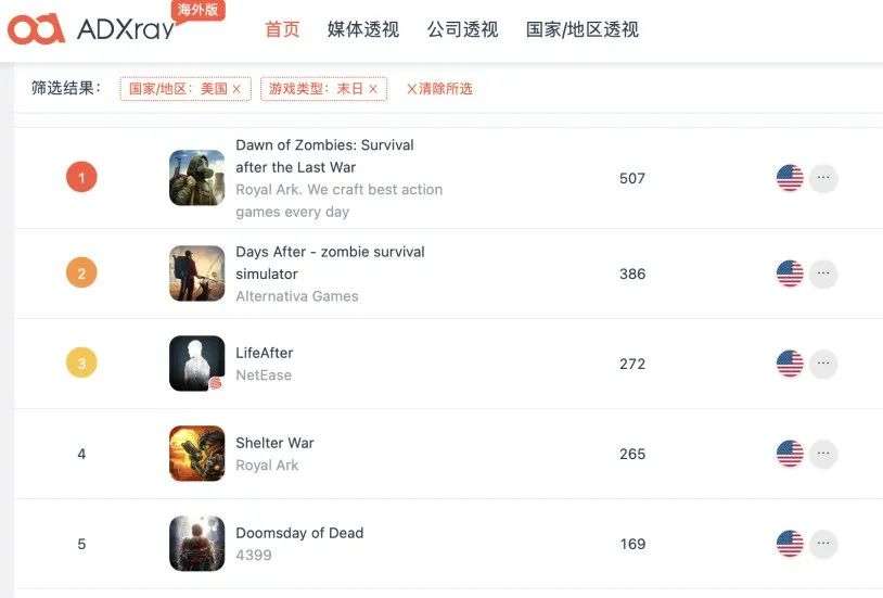 近90天内,末日生存类手游素材投放量,美国稳居第一,截图自DataEye-ADX海外版